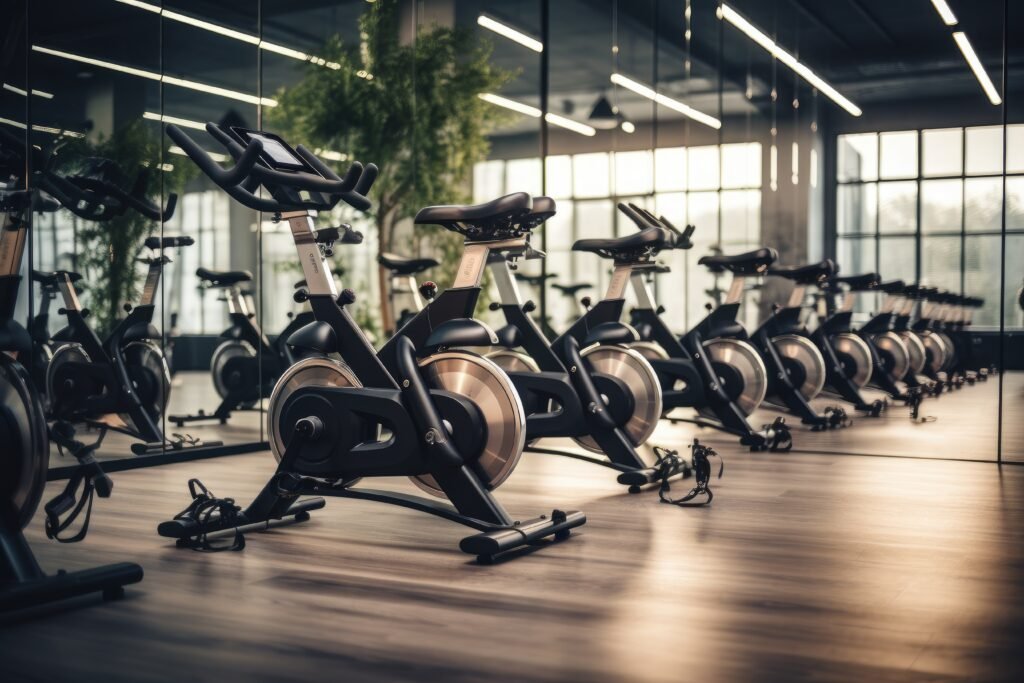 Interior of a fitness hall with rows of exercise bikes in the gym, rows of stationary bikes and health exercise equipment for bodybuilding in gym’s modern fitness center room, AI Generated