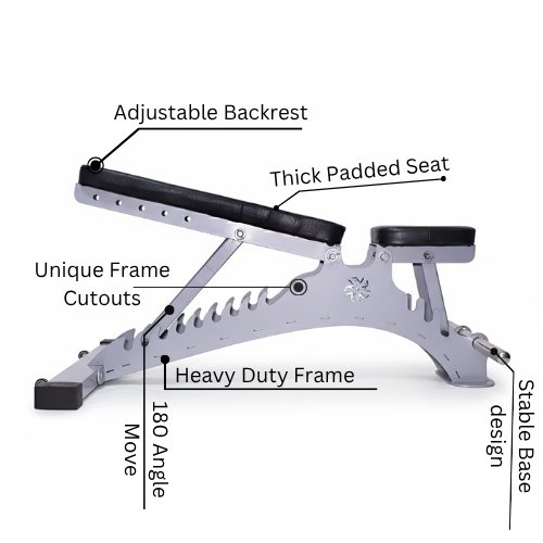 The Adjustable Bench features multiple backrest angles (6–8 levels) and 2–3 seat positions, allowing users to switch easily between flat, incline, and decline workouts. This flexibility supports a wide range of exercises such as bench press, dumbbell fly, shoulder press, sit-ups, and more.